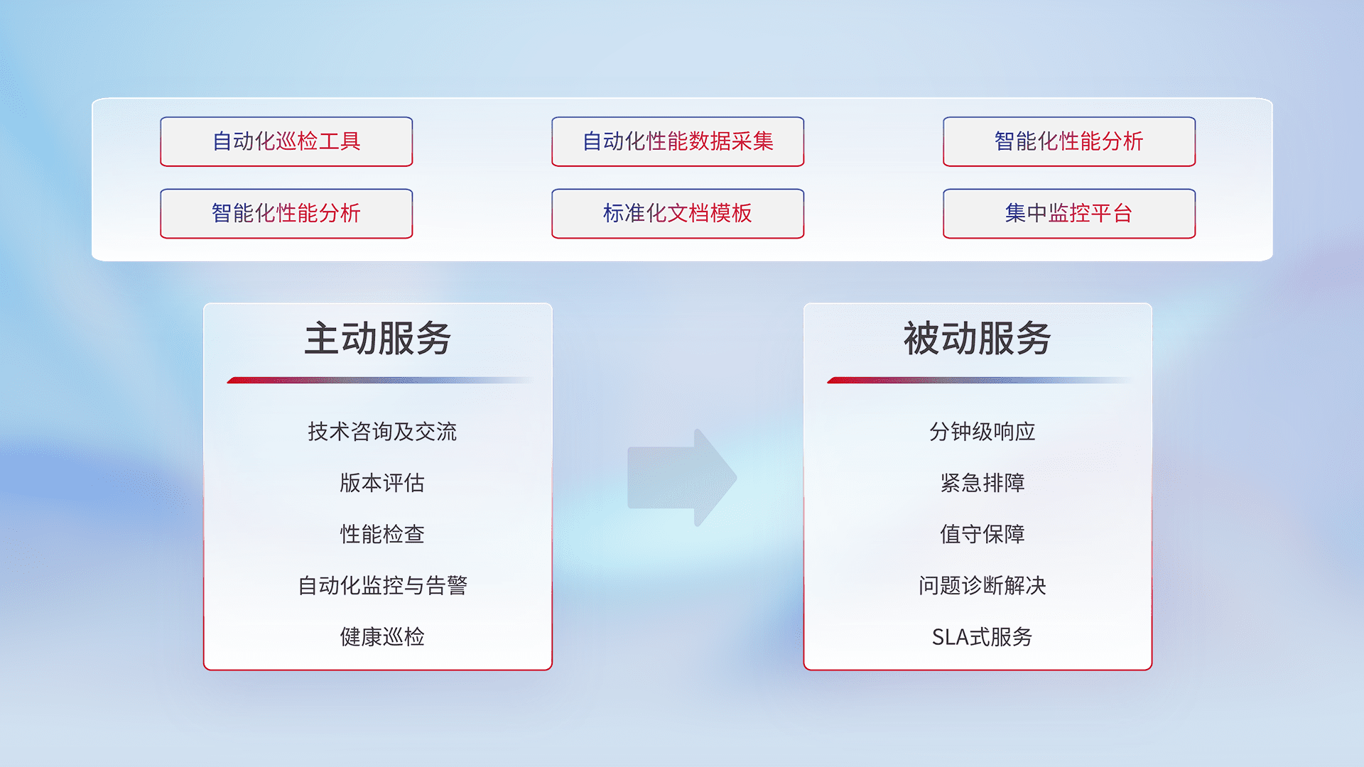 智能化工具和标准化文档,,,保障服务质量,,,,提供主动服务(包含技术咨询、、、版本评估、、性能检查、、自动化监控与告警、、、健康巡检)和被动服务包含(分钟级响应、、、紧急排障、、、、值守保障、、问题诊断解决、、、SLA服务)。。。。